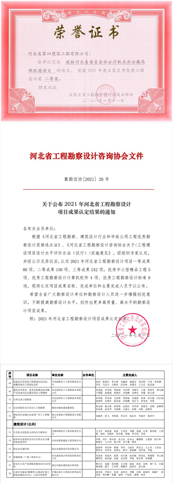 7月5日,公司設(shè)計(jì)院收到榮譽(yù)證書(shū)和文件,《政協(xié)河北省委員會(huì)辦公廳機(jī)關(guān)辦公樓局部改造項(xiàng)目》獲2021年石家莊市優(yōu)秀工程設(shè)計(jì)獎(jiǎng)二等獎(jiǎng)、河北省工程勘察設(shè)計(jì)項(xiàng)目成果獎(jiǎng)三等獎(jiǎng)。