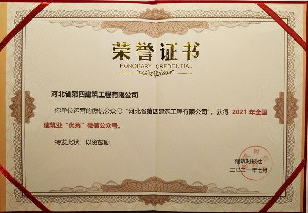 7月16日,在“2021建筑業微信公眾號運維經驗交流研討會暨全國建筑業優秀公眾號頒獎典禮”上,公司微信公眾號“河北省第四建筑工程有限公司”被評為“2021年全國建筑業優秀微信公眾號”。