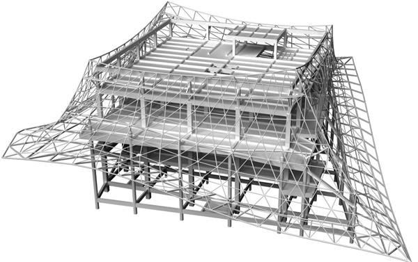 該工程表皮結(jié)構(gòu)采用圓鋼管相貫焊接的單層鋼網(wǎng)格結(jié)構(gòu),局部采用平面鋼桁架,表皮鋁板采用白色穿孔鋁板,雙曲穿孔鋁板外圈穿孔位置距邊線20mm,其余穿孔位置為不規(guī)則孔。面對(duì)外裝飾層鋼結(jié)構(gòu)造型復(fù)雜、精度要求高等挑戰(zhàn),項(xiàng)目部依托BIM技術(shù)構(gòu)建數(shù)字化解決方案,通過Tekla軟件精確計(jì)算桿件內(nèi)力和優(yōu)化拼裝單元,將傳統(tǒng)的二維圖紙轉(zhuǎn)化為三維可視化模型,便于更直觀地理解復(fù)雜節(jié)點(diǎn)和施工流程。利用Navisworks和BIMFILM軟件進(jìn)行施工動(dòng)畫模擬,通過三維可視化模型編排制作吊裝順序,形成吊裝三維演示動(dòng)畫,優(yōu)化施工順序和工序銜接,確保施工安全、質(zhì)量,有效提高施工效率。引入智能測量技術(shù),以全站儀、電子水準(zhǔn)儀等設(shè)備實(shí)時(shí)監(jiān)控安裝精度,形成“模擬預(yù)判+動(dòng)態(tài)糾偏”的質(zhì)量保障體系。在鋼網(wǎng)架安裝前,將全站儀、電子水準(zhǔn)儀、GPS定位系統(tǒng)采集的數(shù)據(jù)進(jìn)行綜合對(duì)比分析,提高測量放線精度,通過實(shí)時(shí)數(shù)據(jù)監(jiān)控及時(shí)調(diào)整施工過程中的誤差,實(shí)現(xiàn)動(dòng)態(tài)糾偏。鋼網(wǎng)架拼裝單元安裝完成后,通過實(shí)際測量采集數(shù)據(jù)與模型進(jìn)行對(duì)比,修正調(diào)整施工誤差。此外,項(xiàng)目部通過無人機(jī)掃描技術(shù)對(duì)安裝后的鋼結(jié)構(gòu)骨架成品空間坐標(biāo)進(jìn)行驗(yàn)收,為后續(xù)鋁板表皮安裝提供精準(zhǔn)數(shù)據(jù),確保建筑外觀效果與設(shè)計(jì)一致。